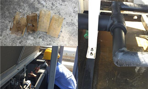此次一共保養(yǎng)8臺冷水機(jī),譚工依次更換過濾網(wǎng)并清洗管道,可以看到更換下來的舊過濾網(wǎng)已經(jīng)生銹,腐蝕嚴(yán)重,清洗時流出來的水都是暗紅色的鐵銹水。