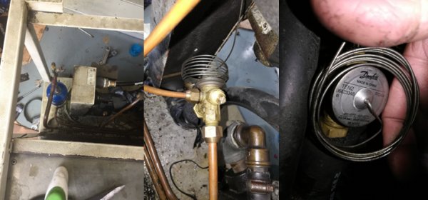 更換新的過(guò)濾器后,用真空泵將系統(tǒng)抽真空,利用這段時(shí)間去吃飯,回來(lái)等到系統(tǒng)完全抽真空,用電子秤定量加入冷媒,當(dāng)冷媒加入到1.676kg的時(shí)候,又發(fā)現(xiàn)冷媒無(wú)法再加入了。開機(jī)排查,發(fā)現(xiàn)膨脹閥也堵塞了,拆下清潔疏通再安裝上還是堵塞,只能更換新的膨脹閥。去附近五金商城找了一圈沒(méi)有買到這個(gè)型號(hào)的膨脹閥,公司倉(cāng)庫(kù)也沒(méi)有庫(kù)存,立即從上海廠商那訂貨直接發(fā)到南通中天。