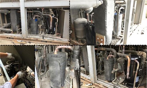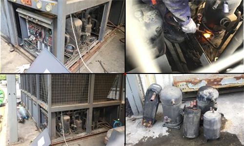此次出現(xiàn)故障的機器是2號車間外的1號冷水機和6號冷水機。第一天,顧工、楊工通力合作檢查,發(fā)現(xiàn)是壓縮機故障引起,需要更換配件。將故障壓縮機、貯液器等設備拆卸下來,用絕緣膠帶將銅管口封上,以防灰層進入。將型號信息反饋回去,公司馬上從倉庫調(diào)度出所需設備,為第二天的維修工作做好準備。